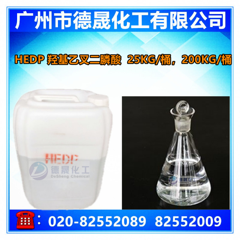 HEDP是一種有機膦酸類阻垢緩蝕劑,能與鐵、銅、鋅等多種金屬離子形成穩定的絡合物,能溶解金屬表面的氧化物。在250℃下仍能起到良好的緩蝕阻垢作用,在高pH下仍很穩定,不易水解,一般光熱條件下不易分解。耐酸堿性、耐氯氧化性能較其它有機膦酸(鹽)好。可與水中金屬離子,尤其是鈣離子形成六圓環螯合物,因而具較好的阻垢效果并具明顯的溶限效應,當和其它水處理劑復合使用時,表現出理想的協同效應。